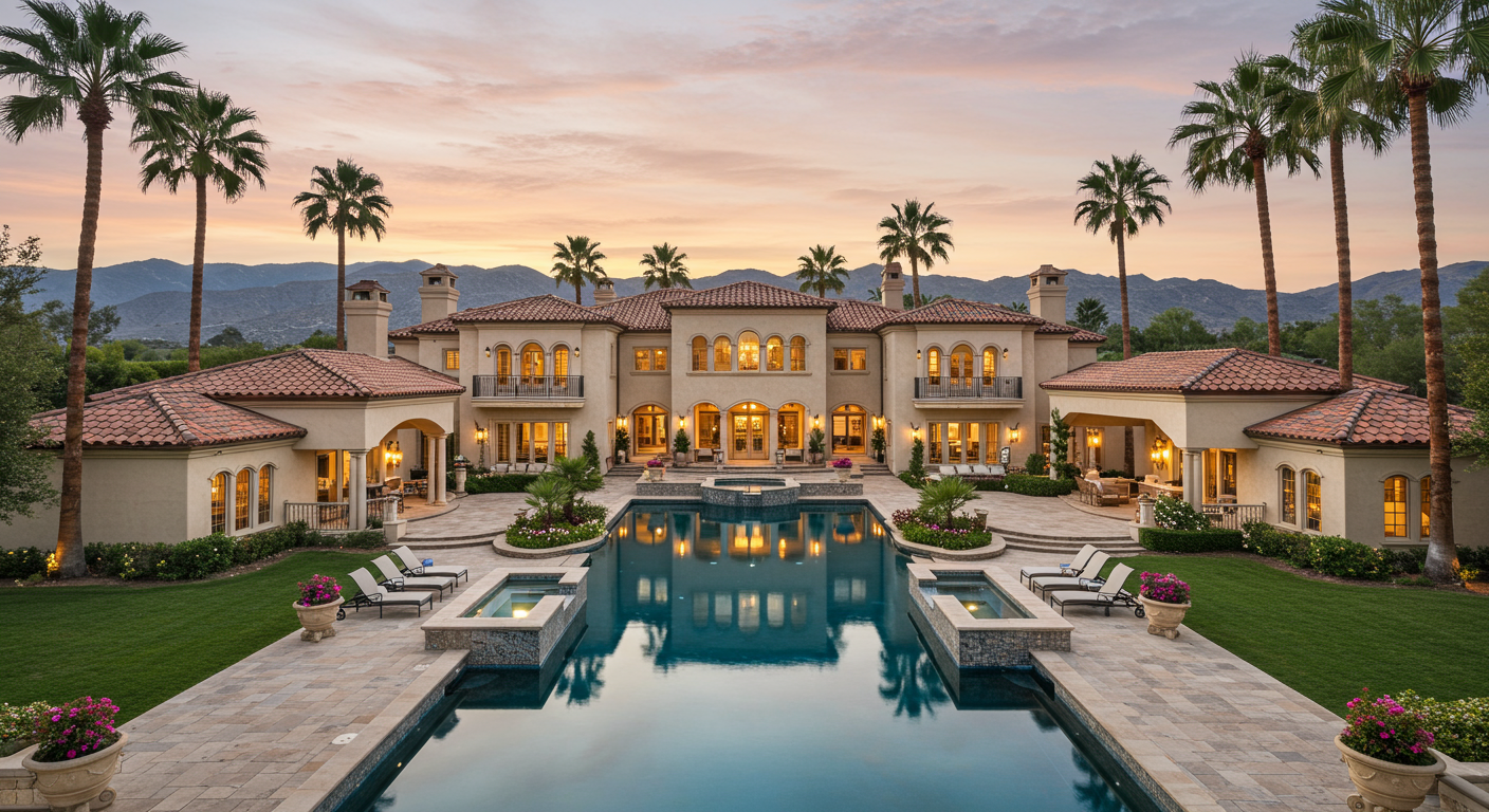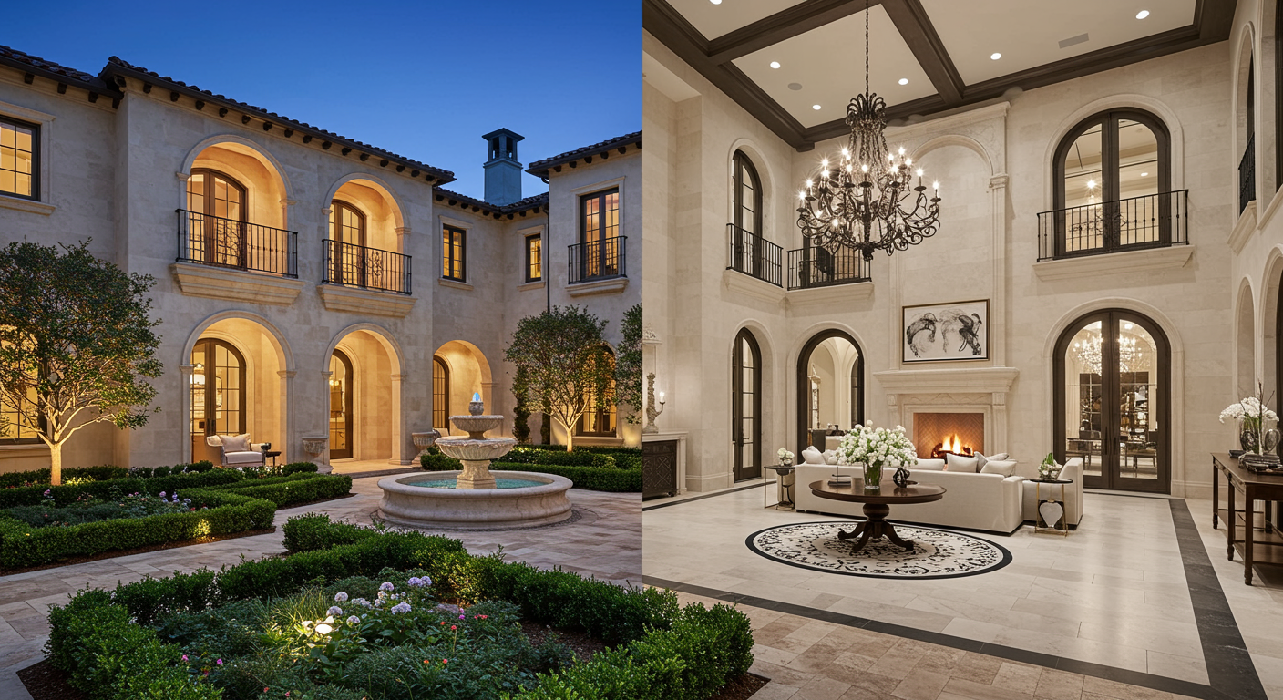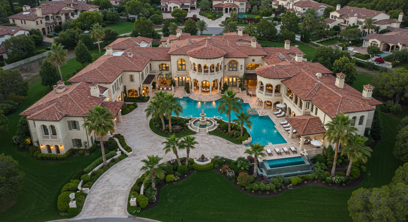 A tree-lined gated drive to the seven-bedroom main house, elegantly reimagined by the homeowner throughout the 2020s. Extensively expanded over time, it now measures 15,267 square feet over two levels. Venetian plaster walls throughout, Swarovski Crystal chandeliers, artisanal woodwork, custom built-ins, and soaring wood-beamed ceilings.