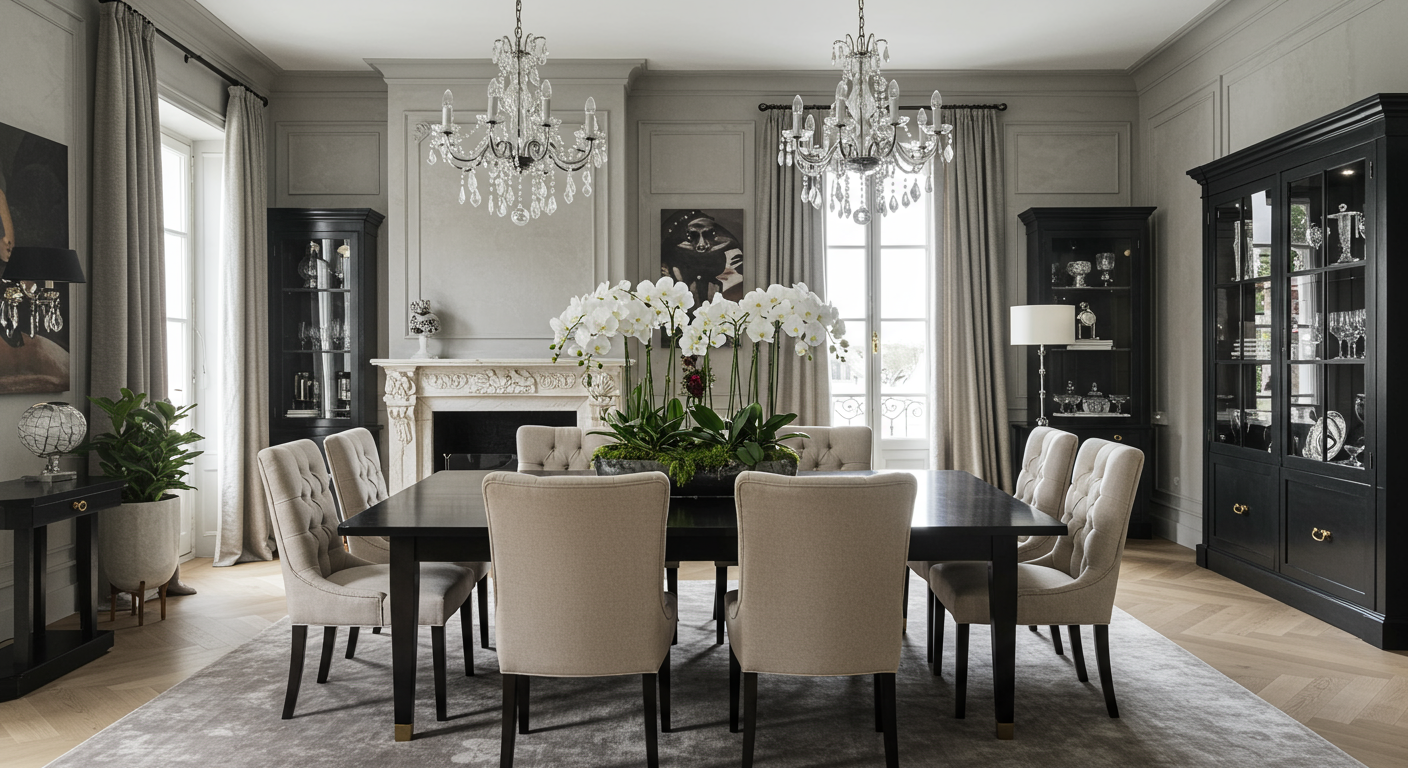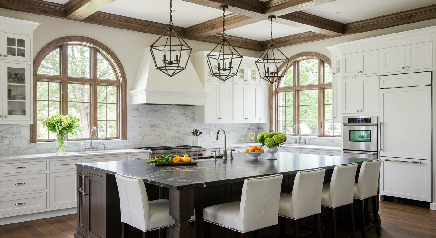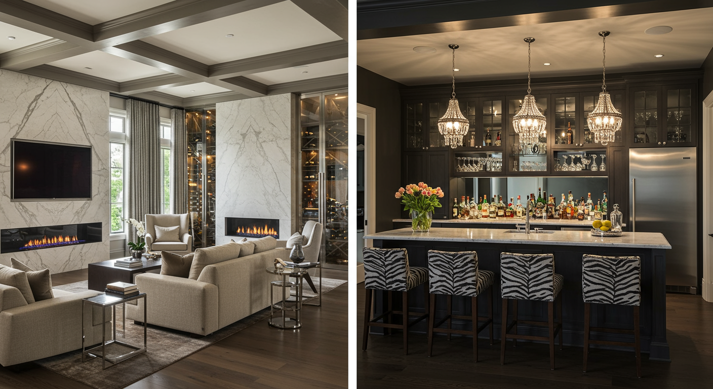 A tree-lined gated drive to the seven-bedroom main house, elegantly reimagined by the homeowner throughout the 2020s. Extensively expanded over time, it now measures 15,267 square feet over two levels. Venetian plaster walls throughout, Swarovski Crystal chandeliers, artisanal woodwork, custom built-ins, and soaring wood-beamed ceilings.