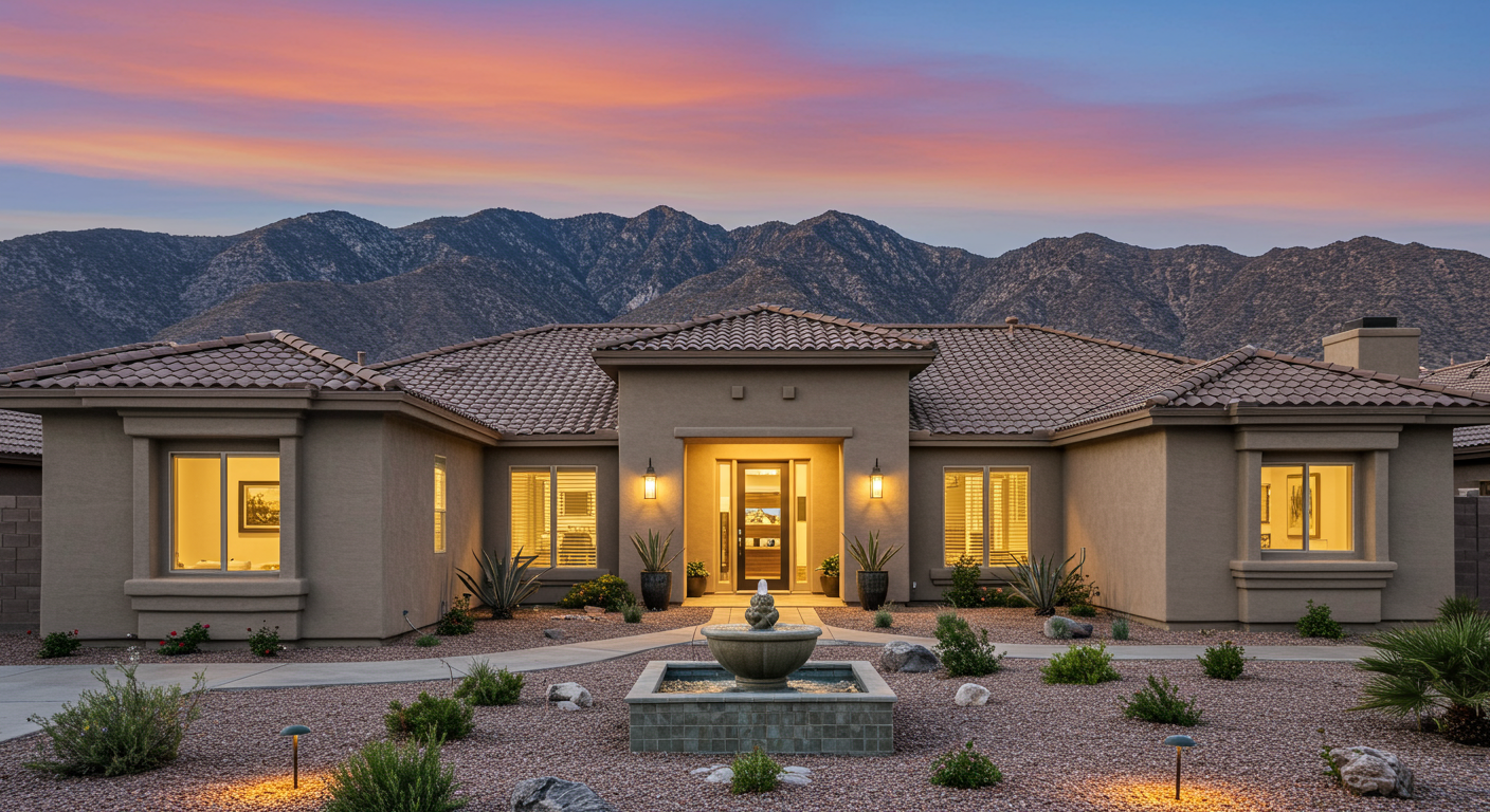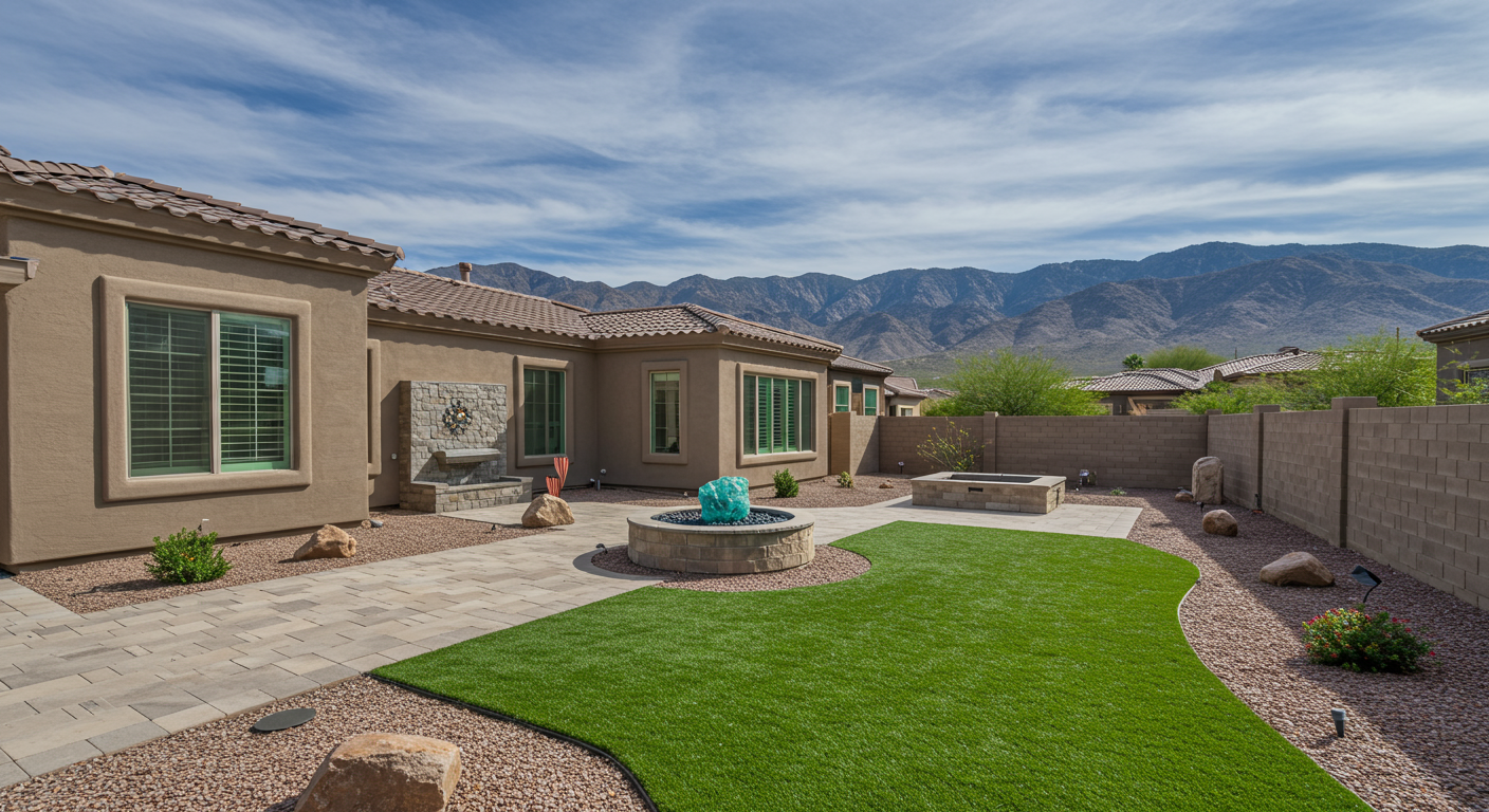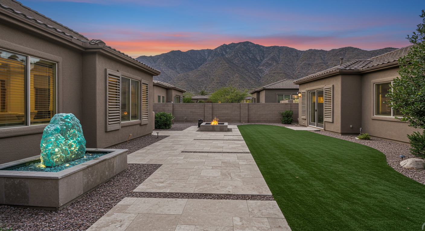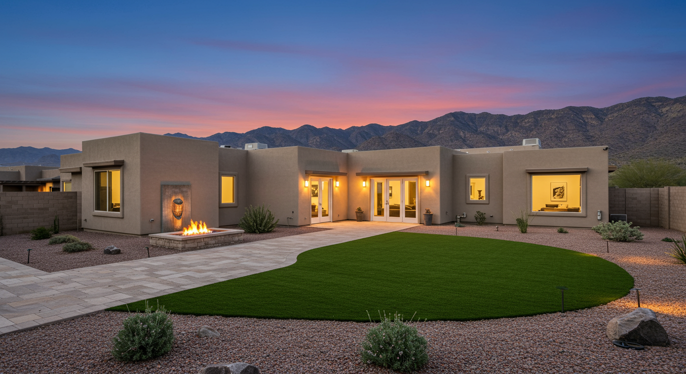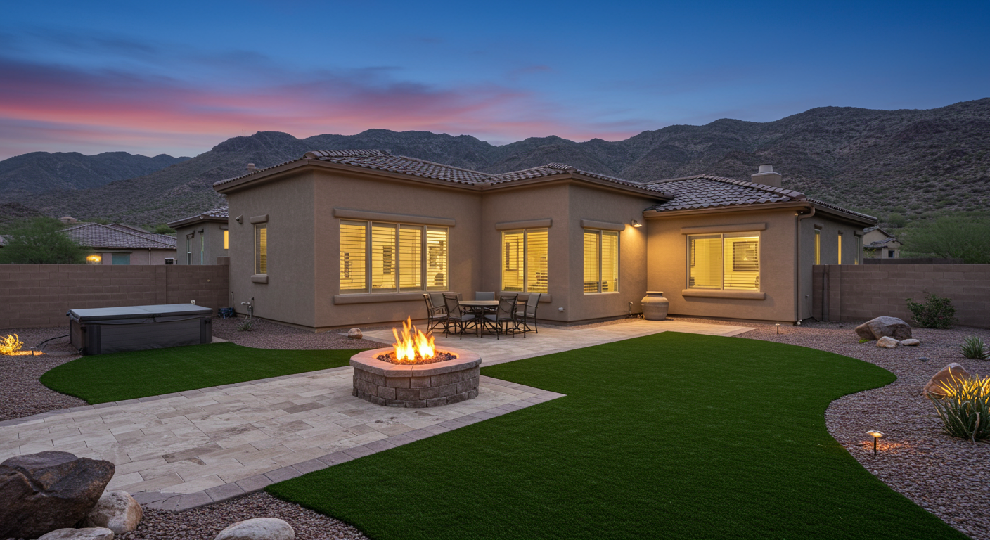 Stunning new home in Sky Crossing. This popular Patagonia model sits on an upgraded view lot with mountain views. As you enter the home you will be greeted by the soothing sounds of the fountain in the courtyard. This home has been highly upgraded. The gourmet kitchen has high-level granite, beautiful cabinetry, and glass backsplash. Bathrooms have quartz counters and lovely tile work. Spacious master bedroom with large closet and master bath. 2 secondary bedrooms, den/office, and bonus room allow for plenty of space and options. Tranquil backyard has travertine pavers, turf, glass rock firepit, lighting, and therapeutic spa. Shutters, whole home water treatment system, tinted windows, crown molding, large laundry room with sink and cabinetry, epoxy floors in garage.