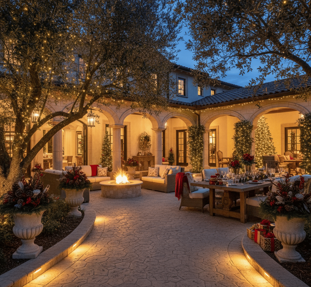 Choose a cohesive holiday palette that enhances your home’s architecture. Neutrals paired with greenery, gold, or bronze feel timeless. Incorporate texture — linen, velvet, woven rattan — to balance modern and organic aesthetics.