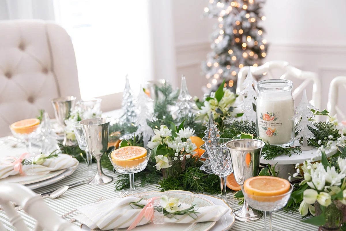 Focus on one or two statement moments: a sculptural wreath at the entry, a minimal tablescape with citrus and herbs, or candles clustered in architectural vessels.